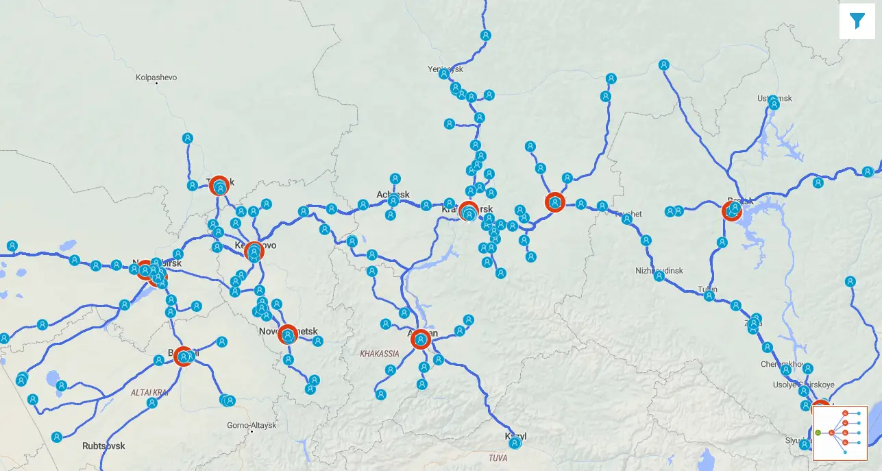 In the third phase, the team started scaling up the developed scenarios. To that end, they created a supply chain model of 200,000 clients. Next, they joined those clients who were in close vicinity to each other into clusters using anyLogistix Greenfield Analysis capabilities. When analyzing routes to clients, the algorithms excluded economically inefficient routes. For suitable routes, the required number of vehicles and their loads were calculated.