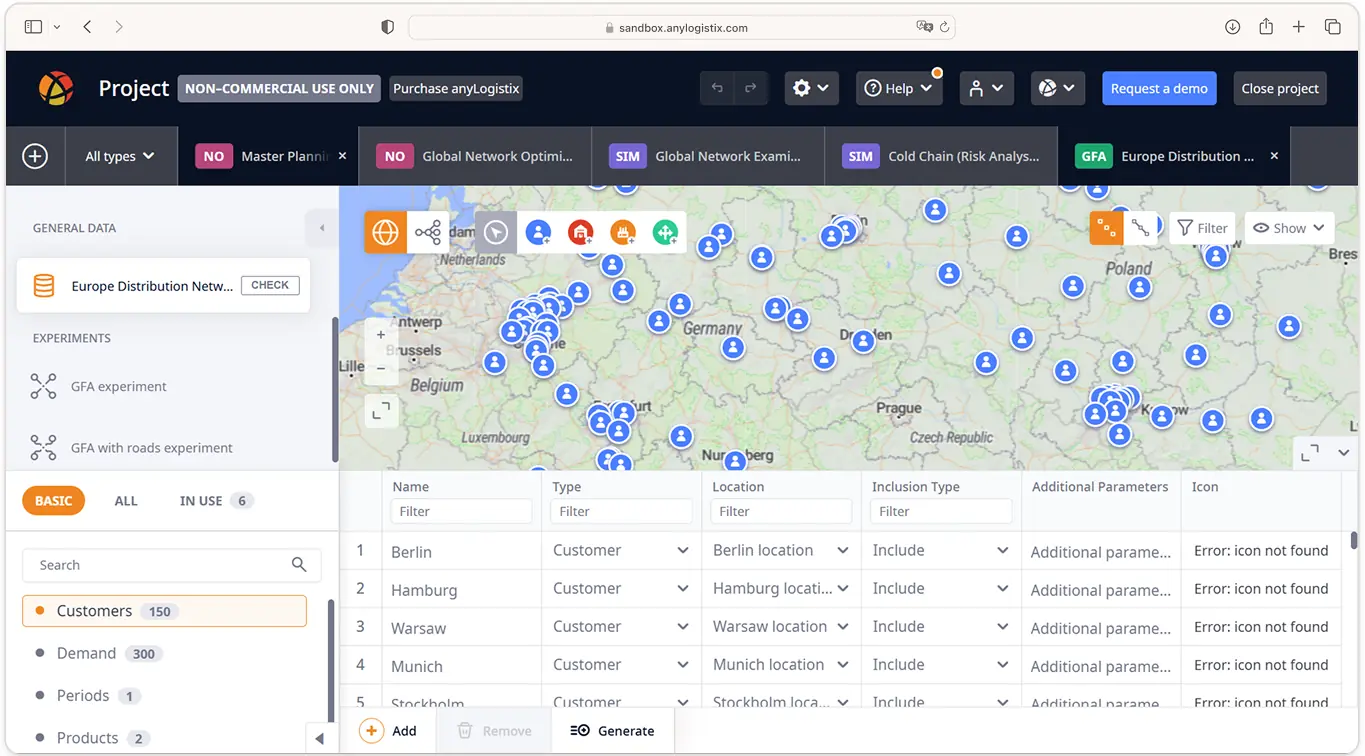Sandbox includes most anyLogistix features, although it is still a demonstration environment, so some advanced capabilities are intentionally limited: