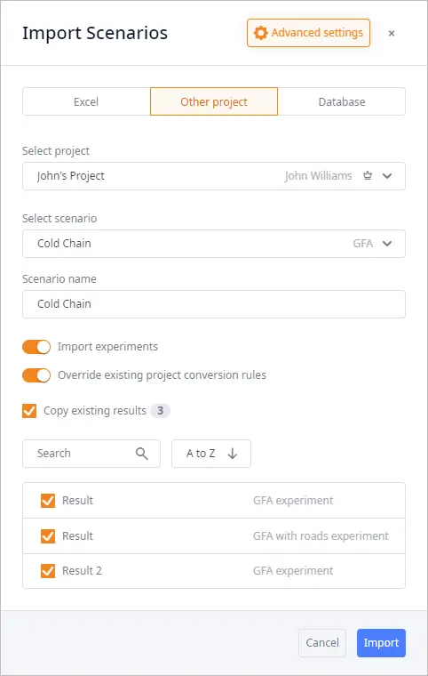 Team members can import complete scenarios, experiment results only, or some of the results, ensuring smooth transitions between project stages.